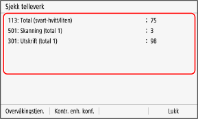 Handlinger som er tilgjengelig på skjermbildet for tellerElementene som vises på skjermen avhenger av land eller region. Trykk på [Overvåkingstjen.] når du vil sjekke forbindelsen til overvåkingserveren. Utfør denne handlingen når du vil jevnlig sende informasjonen for maskinen til overvåkingserveren. Trykk på [Kontr. enh. konf.] når du vil sjekke konfigurasjonen for alternativene på maskinen.