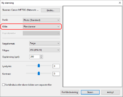Velg skannerdriver (ScanGear MF eller WIA) for maskinen og konfigurer skanneinnstillingene.