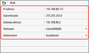 Du kan vise innstillingen for IP-adresse som er stilt inn på maskinen, som IPv4-adresse og IPv6-adresse.