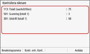 Funktioner som finns tillgängliga på skärmen med kontrollräknareInformationen som visas på skärmen varierar mellan olika länder och regioner. Tryck på [Bevakningsservice] när du vill kontrollera anslutningen till övervakningsservern. Utför den här funktionen för att regelbundet skicka information från enheten till övervakningsservern. Tryck på [Kontr. enh. Konf.] när du vill kontrollera vilka inställningar som har valts för enheten.