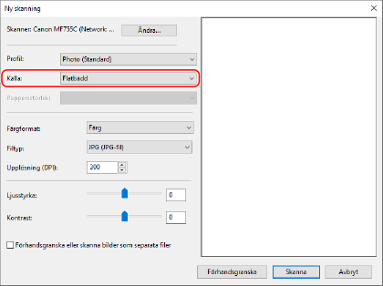 Välj skannerdrivrutinen (ScanGear MF eller WIA) för enheten och ange skanningsinställningar.