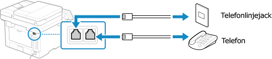 5 | Anslut den medföljande telefonkabeln till uttaget på enheten (LINE) och telefonjacket på väggen. ![]() Anslut telefonen till uttaget för extern telefon (HAND SET/EXT.) på enheten. Om du ansluter en telefon med faxfunktion ska du inaktivera automatisk faxmottagning i telefonen. Enheten kanske inte kan sända och ta emot fax på rätt sätt beroende på vilken typ av telefon som är ansluten till den. |