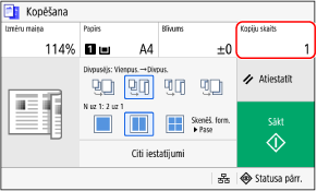 Nospiediet [Kopiju skaits], izmantojiet ciparu taustiņus, lai ievadītu kopiju skaitu, un nospiediet [Aizvērt].