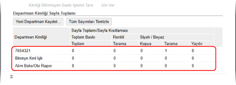 Departman Kimliği Yönetimi etkinleştirildiğinde, her Departman Kimliği için yazdırılan ve kopyalanan sayfa sayısını görüntüleyebilirsiniz.