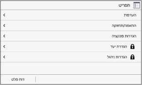 מסך זה מוצג כאשר לוחצים [תפריט] במסך [בית]. השתמש במסך זה כדי להגדיר את ההגדרות השונות של המכשיר.