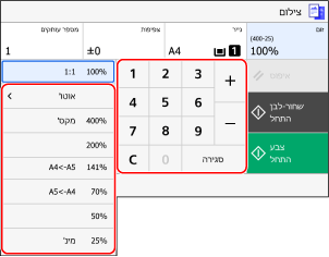 ניתן להגדיר לצילום כל יחס הגדלה/הקטנה, מ-25 % עד 400 %, במרווחים של 1 %.