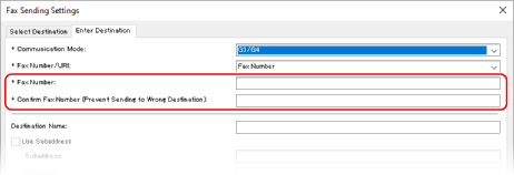 הזן את מספר הפקס בלשונית ה-[Enter Destination]. כאשר [Confirm Fax Number (Prevent Sending to Wrong Destination)] ניתן להזנה, הזן את אותו מספר פקס.