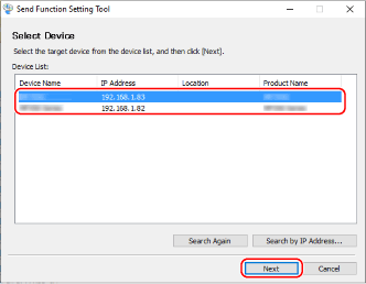 אם המכשיר אינו מופיע ב-[Device List], לחץ [Search Again]. אם הבעיה נמשכת, לחץ על [Search by IP Address], הזן את כתובת ה-IP של המכשיר ולאחר מכן לחץ על [OK].