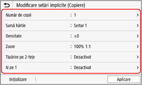 Selectați elementele de setare care se vor modifica și schimbați setările implicite.