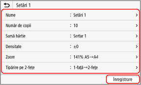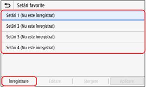 Utilizați panoul de control pentru a înregistra setările favorite. Nu puteți înregistra setările favorite folosind Remote UI (IU la distanță) de la un computer.