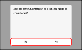 Când selectați [Nu], setarea favorită este înregistrată, dar nu se adaugă un buton pentru comenzi rapide. Ulterior, puteți adăuga un buton pentru comenzi rapide la ecranul [Pornire].
