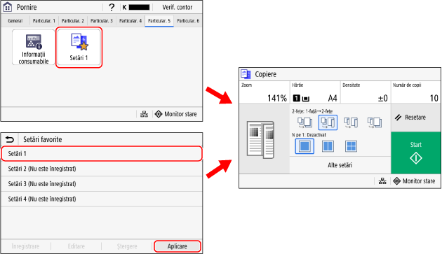 Puteți apela setările înregistrate pentru operare rapidă folosind butoanele pentru comenzi rapide adăugate la ecranul [Pornire] de pe panoul de control și ecranul fiecărei funcții. Puteți modifica setările și după apelarea acestora, după cum este necesar.