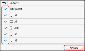 Formatele de hârtie ale căror casete de selectare sunt debifate nu sunt afișate pe ecranul cu setările hârtiei.