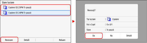Dacă se afișează ecranul cu lista de lucrări, selectați lucrarea de anulat și apăsați pe [Revocare]