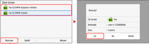 Dacă se afișează un ecran cu lista de lucrări, selectați lucrarea de anulat și apăsați pe [Revocare]