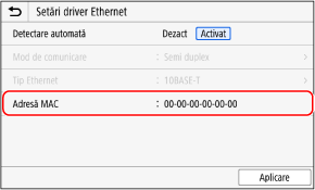 Puteți vizualiza adresa MAC setată la aparat atunci când aparatul este conectat la rețeaua LAN cu fir.