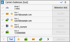 Vous pouvez également spécifier rapidement les destinataires à partir de l’écran du carnet d’adresses, par exemple en regroupant les destinataires ou en les affichant par type.