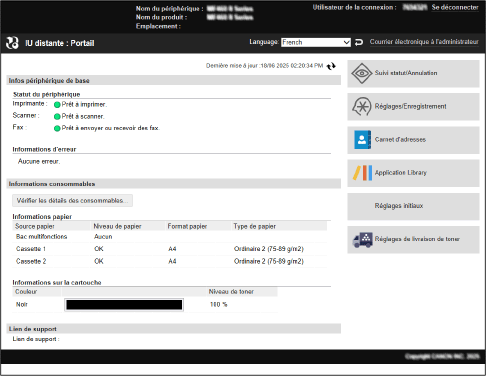 Lorsque vous vous connectez à l'interface utilisateur distante, la page Portail (page d'accueil de l'interface utilisateur distante) s'affiche. Depuis cette page, vous pouvez vérifier l'état d'utilisation de l'appareil, afficher diverses informations et changer les paramètres au moyen de boutons.