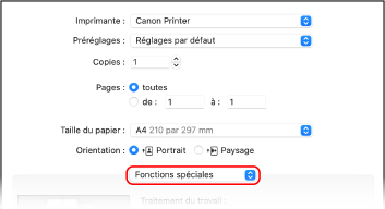 2 | Dans le menu contextuel des options d'impression, sélectionnez [Fonctions spéciales]. Si les options d’impression ne s’affichent pas, cliquez sur [Afficher les détails] dans la boîte de dialogue d’impression. |