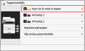 Om du alltid använder samma papper i multiutmatningsfacket kan du registrera pappersformat och papperstyp. Det förhindrar att skärmen för pappersinställningar visas vilket besparar dig arbetet med att ange inställningarna.