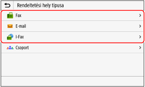 A rendeltetési hely adatainál nyomja meg az [E-mail cím], [I-Fax cím] vagy [Faxszám] lehetőséget, adja meg az adatokat, majd nyomja meg az [Alkalmaz] gombot.