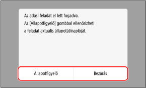 Amikor a beolvasás befejeződik, a készülék menti a beolvasott adatokat. A mentési állapot és a napló megtekintéséhez használja az [Állapotfigyelő] lehetőséget. A beolvasott adatok küldési és mentési állapotának és naplójának megtekintése