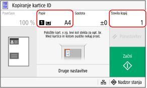 S funkcijo Kopiranje osebnih izkaznic lahko kopirate sprednjo in zadnjo stran vozniškega dovoljenja ali druge osebne izkaznice na isti list papirja pri 100-odstotni povečavi. To lahko hitro izvedete na zaslonu [Domov] na nadzorni plošči. To je na primer priročno pri kopiranju osebnih izkaznic na recepciji.