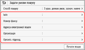 4 | Виберіть [Спосіб пошуку], а потім виберіть умови пошуку. Щоб знайти користувачів, які відповідають усім елементам, указаним на кроці 3, виберіть [З урахув. усіх умов, зазнач. нижче]. Щоб знайти користувачів, які відповідають будь-яким елементам, указаним на кроці 3, виберіть [З урах. деяких умов, зазнач. нижче]. |