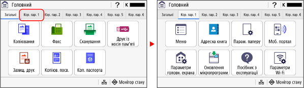 Торкніться екрана та перегорніть його кінчиком пальця. Екран рухається в напрямку гортання. Наприклад, екран [Головний] перегортається на відповідну вкладку в напрямку гортання пальцем.