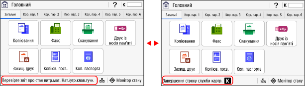 Цей екран відображається, якщо натиснути [Монітор стану] на екрані [Головний] і в інших розташуваннях. Цей екран дає змогу перевірити інформацію про апарат, його використання та журнали, параметри мережі й відомості про помилки.