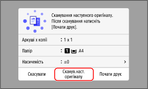 Якщо оригінальний примірник розміщено на сканувальному склі і він копіюється за допомогою методу 2-стороннього друку або N на 1, відображається екран для сканування наступного оригінального примірника.