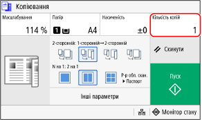 Натисніть [Кількість копій], за допомогою клавіш із цифрами введіть кількість копій і натисніть [Закрити].