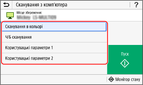 Формат даних сканування, місце збереження на комп’ютері та інші параметри встановлюються для кожного сканування. Оригінал сканується відповідно до вибраних параметрів сканування.