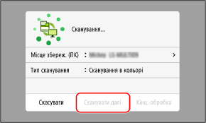 Щоб продовжити сканувати оригінальні примірники, розмістіть їх на сканувальному склі та натисніть [Сканувати далі].