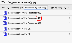 Якщо неможливо виконати друк, надіслати або отримати дані сканування чи факс, а також у разі іншої помилки, у звіті або журналі завдань відображається код помилки (тризначний номер, якому передує символ #).