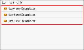 스캔 또는 팩스 화면의 [수신인 지정] 탭에서 [송신 이력]을 누릅니다.