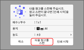 원고를 원고대 위에 놓거나 양면 복사 또는 N on 1을 사용하여 원고를 복사하는 경우, 다음 원고를 스캔하기 위한 화면이 표시됩니다.