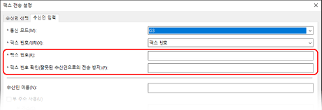 [수신인 입력] 탭에서 팩스 번호를 입력합니다. [팩스 번호 확인(잘못된 수신인으로의 전송 방지)]을 입력할 수 있는 경우에는 동일한 팩스 번호를 입력합니다.