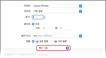 인쇄 옵션 팝업 메뉴에서 [특수 기능]을 선택합니다.
