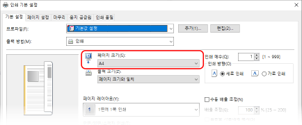[기본 설정] 탭의 [페이지 크기]에서 문서의 용지 크기를 선택합니다.