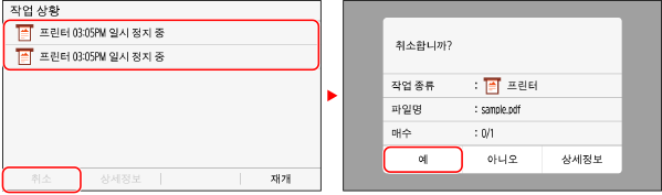 작업 목록 화면이 표시되면 취소할 작업을 선택하고 [취소]