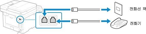5 | 제공된 전화 코드를 기기의 전화선 잭(LINE)과 벽의 전화선 커넥터에 연결합니다. ![]() 전화기를 기기의 외부 전화 잭(HAND SET/EXT.)에 연결합니다. 팩스 기능이 있는 전화를 연결하는 경우 전화기에서 팩스 자동 수신 설정을 반드시 비활성화하십시오. 연결된 전화 유형에 따라 기기에서 팩스를 제대로 전송하거나 수신하지 못할 수 있습니다. |