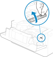 1 | 전면의 녹색 손잡이를 잡은 상태로 이송 가이드를 들어 올립니다. 이송 가이드가 3단계의 원래 위치에 도달하기 전까지 이송 가이드를 놓지 않습니다. |