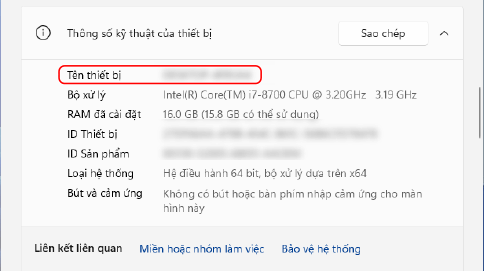 Trong [Thông số kỹ thuật của thiết bị], xem tên máy tính.