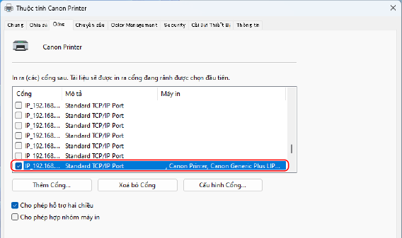 Nếu Địa Chỉ IP Của Máy Được Thay ĐổiHành động bắt buộc sẽ tùy thuộc vào cổng mà bạn đang sử dụng. Nếu [Canon MFNP Port] được hiển thị trong [Description], kết nối sẽ được duy trì miễn là máy in và máy tính thuộc cùng một mạng con, vì vậy không cần thực hiện hành động gì trên máy tính. Nếu [Standard TCP/IP Port] được hiển thị trong [Description], bạn phải thêm một cổng mới. Thêm Cổng |