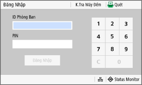 Khi Quản Lý ID Phòng Ban được thiết lập, màn hình đăng nhập sau đây sẽ hiển thị. Nhập ID Phòng Ban để đăng nhập. Nếu mã PIN được thiết đặt, hãy nhập mã PIN.