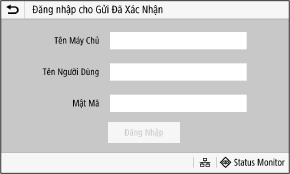 Khi gửi được xác thực (Xác thực máy chủ LDAP) được đặt, màn hình Đăng Nhập cho Gửi Được Xác Thực sẽ hiển thị khi thực hiện các thao tác quét và fax. Nhập tên người dùng và mật khẩu được quản lý bằng máy chủ LDAP để đăng nhập.
