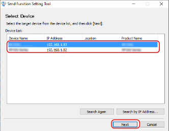 Nếu máy không được hiển thị trong [Device List], nhấp vào [Search Again]. Nếu máy vẫn không được hiển thị, nhấp vào [Search by IP Address], nhập địa chỉ IP của máy, sau đó nhấp vào [OK].