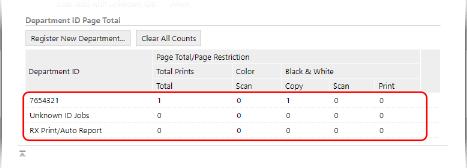 Bạn có thể xem số trang đã in và sao chụp cho mỗi ID Phòng Ban khi kích hoạt Quản Lý ID Phòng Ban.