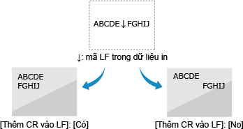 Chọn có thêm dấu xuống dòng (CR) khi máy in nhận được mã xuống dòng (LF) hay không. Nếu [Có] được chọn, vị trí in sẽ di chuyển đến đầu dòng tiếp theo khi máy nhận được mã LF. Nếu [No] được chọn, vị trí in sẽ di chuyển đến dòng tiếp theo, ngay phía dưới mã LF đã nhận. |